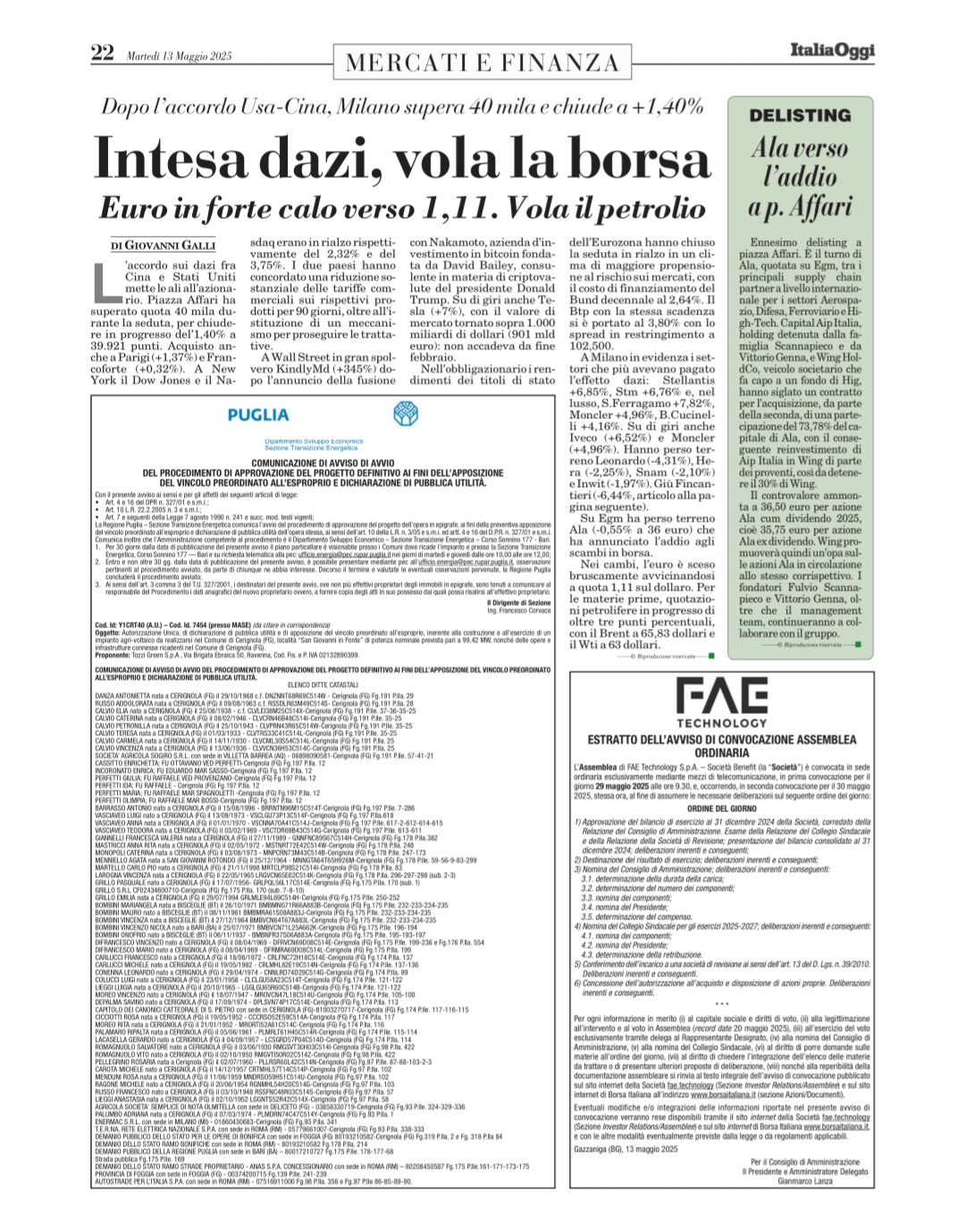 - the price, amount and class of the financial instruments of FAE Technology S.p.A. – Benefit Company involved;