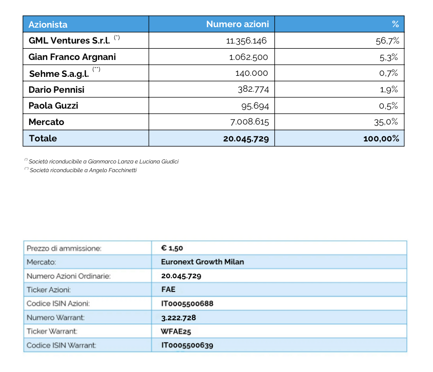 Le azioni ordinarie di FAE Technology S.p.A. – Società Benefit sono ammesse alle negoziazioni sull’Euronext Growth Milan.