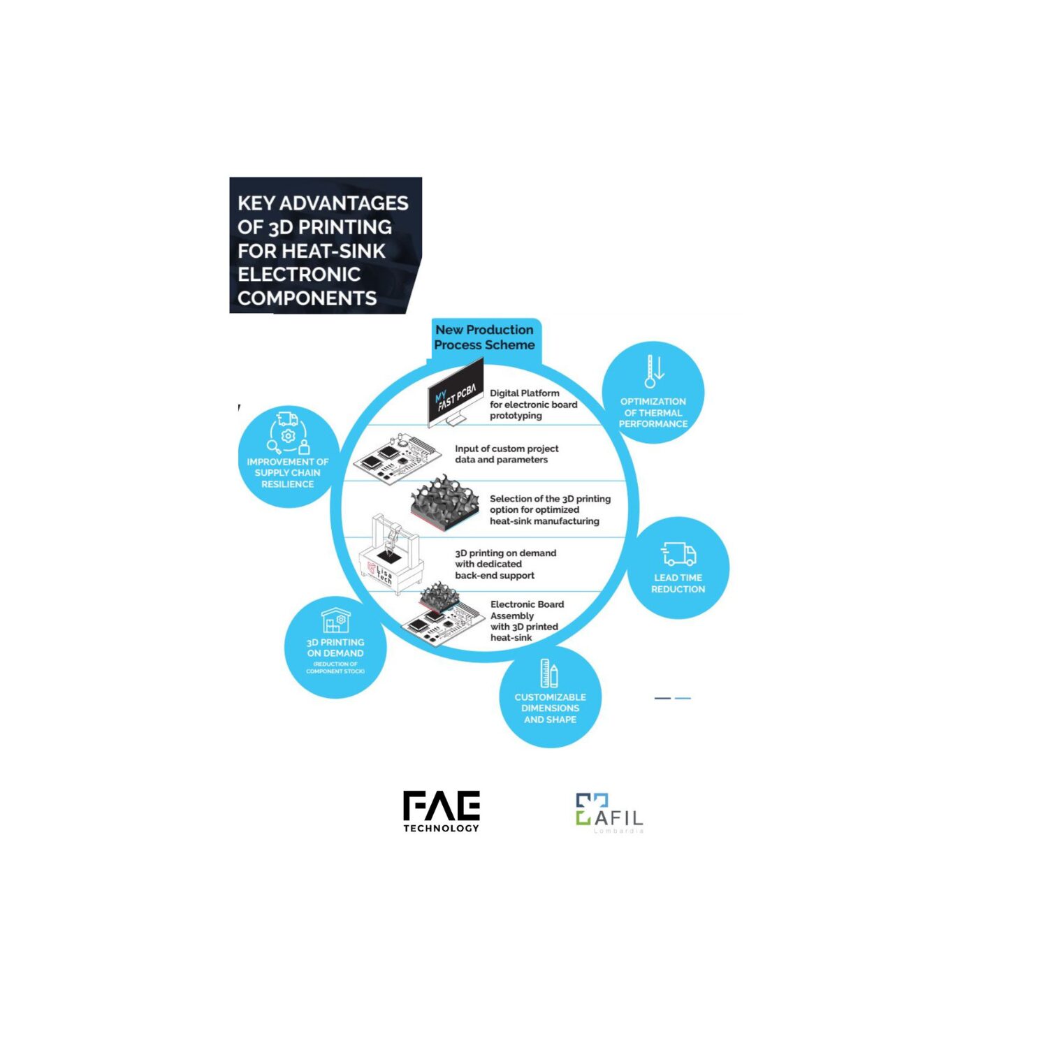 Scopo del progetto LAB 3D-MES è quello di testare e validare all’interno della produzione di FAE Technology una nuova tecnologia di prototipazione rapida e stampa 3D della componente PCB (Printed Circuit Board) che è l’elemento fondamentale di una scheda elettronica.